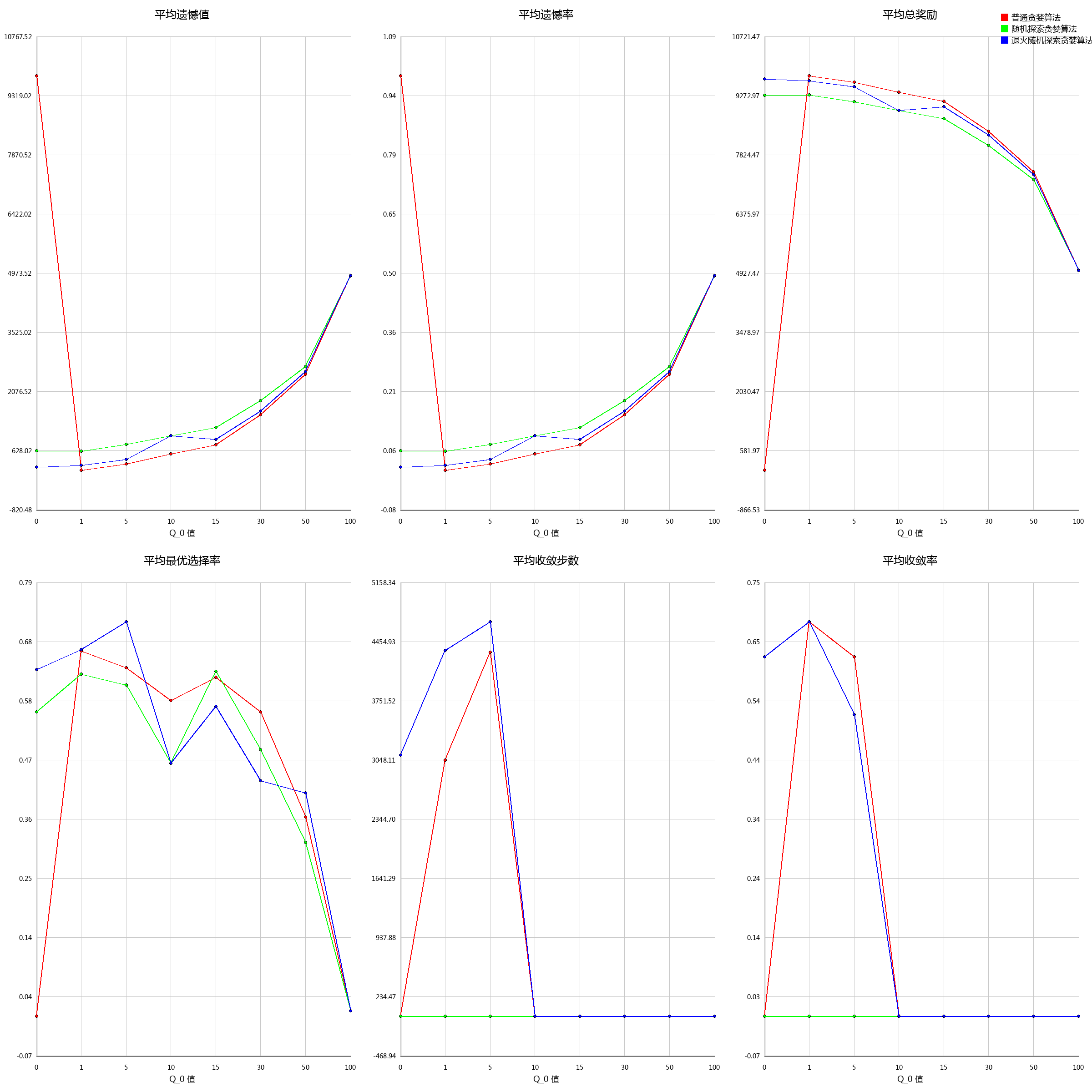 在 Q_0 = 0 的时候,各算法中退火随机探索贪婪算法表现最好。