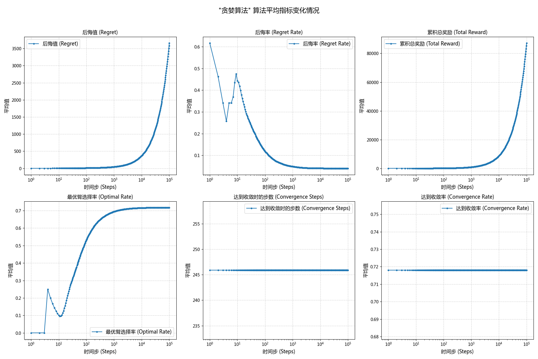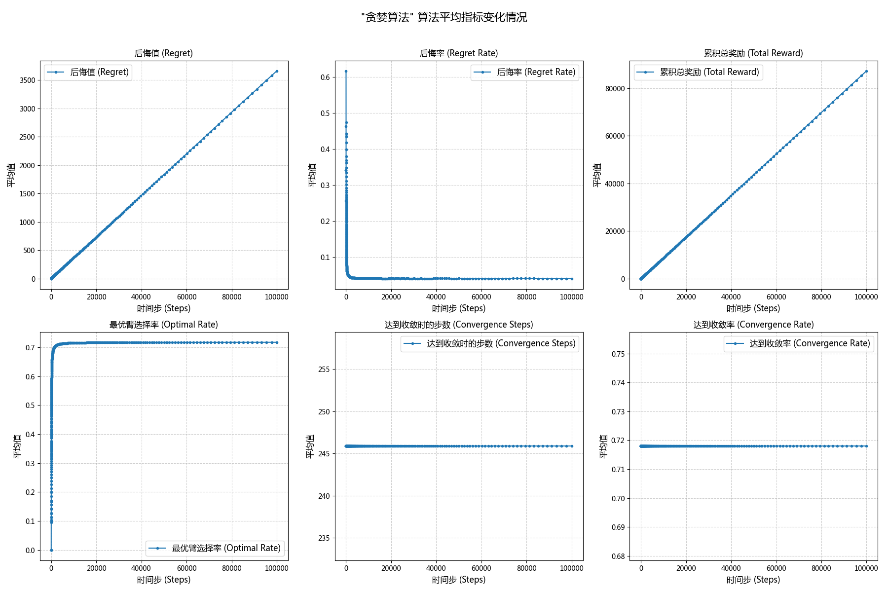 - Greedy 的命中率收敛于约 71.8% ,表明其已陷入局部最优,无法稳定选择真正奖励最高的臂。