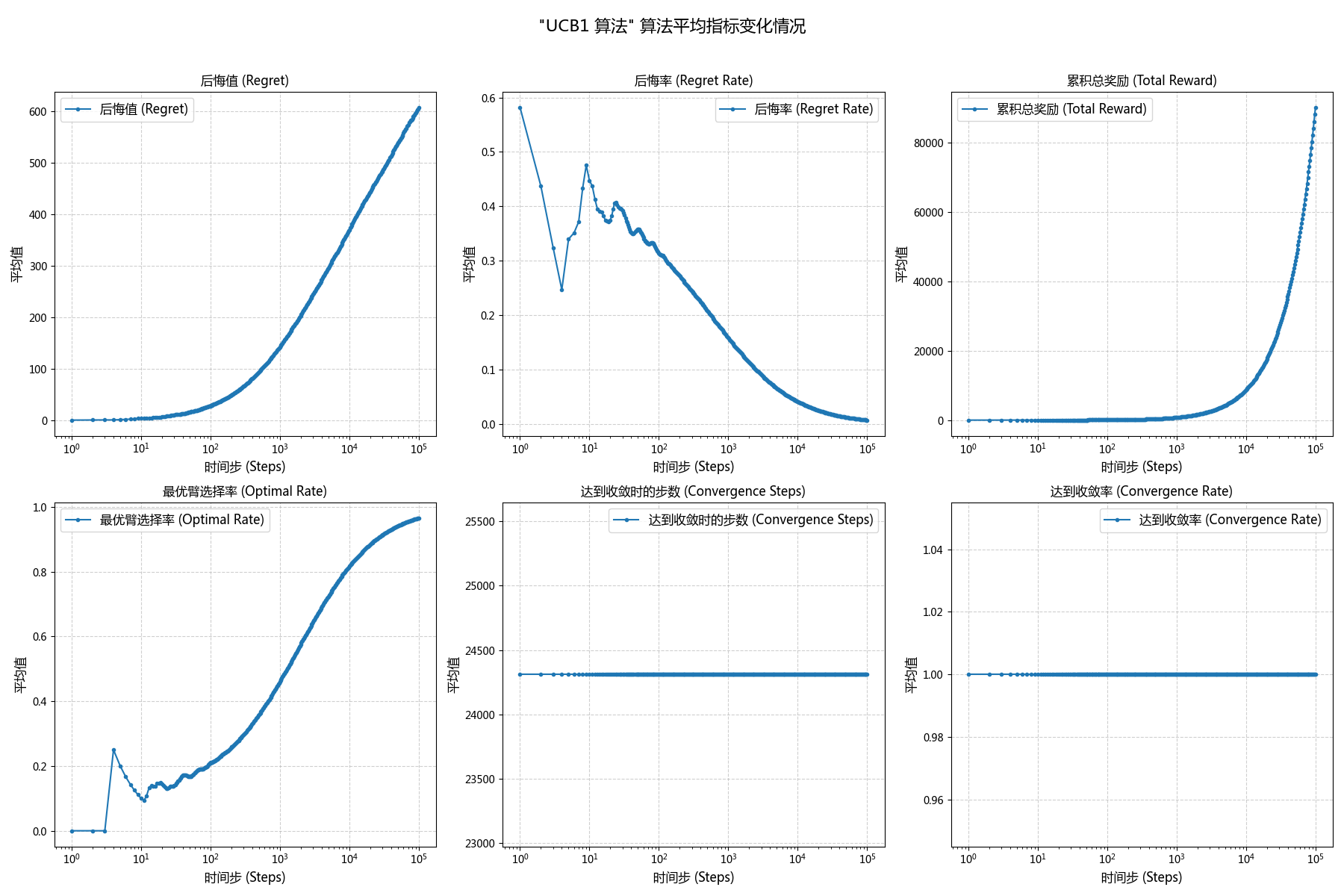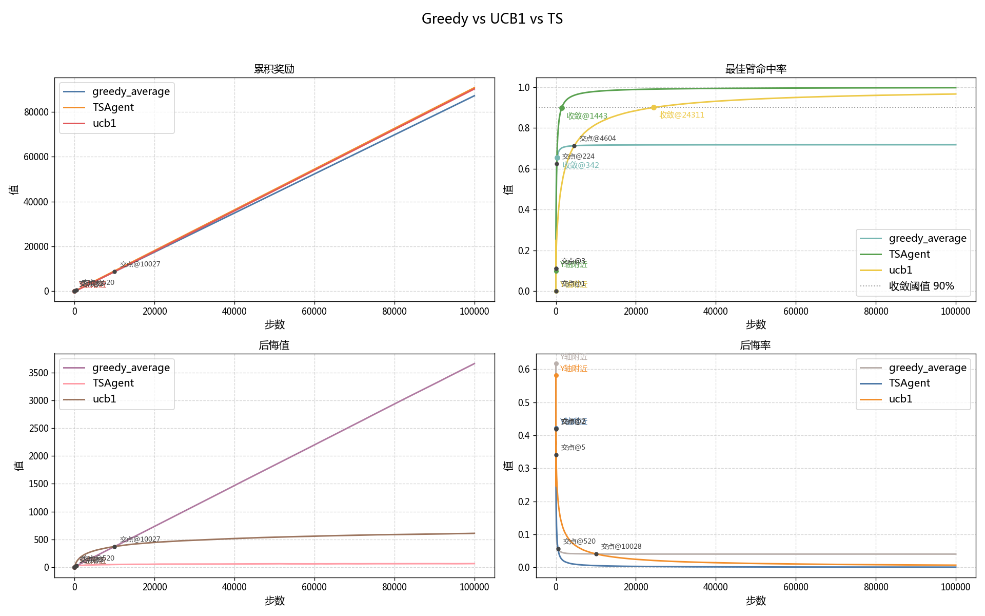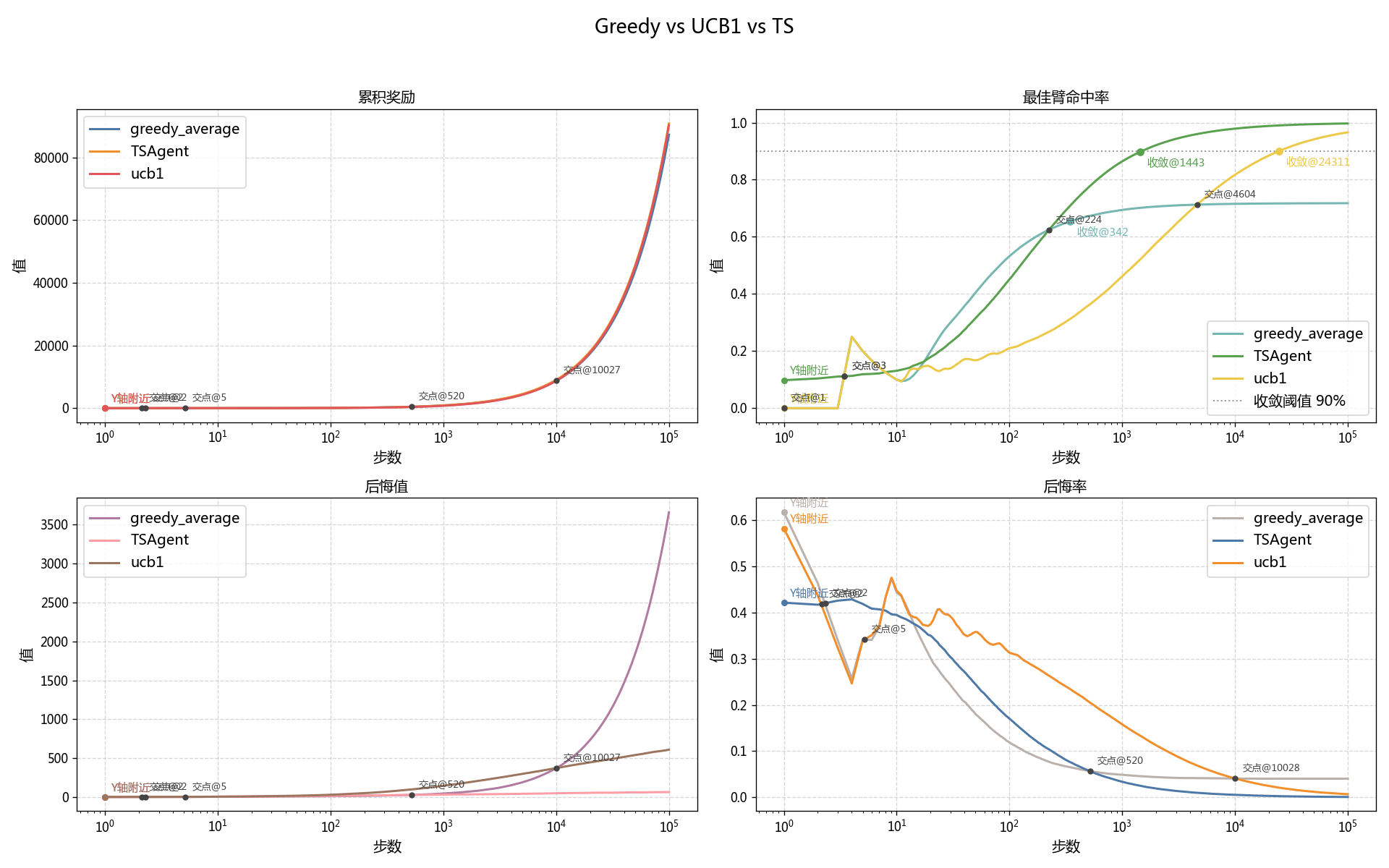 - 相比之下,UCB1 和 TS 算法则呈现出对数增长的趋势。曲线在早期斜率较大(探索代价),后期则趋于平缓,表明算法收敛后产生的后悔值极低。