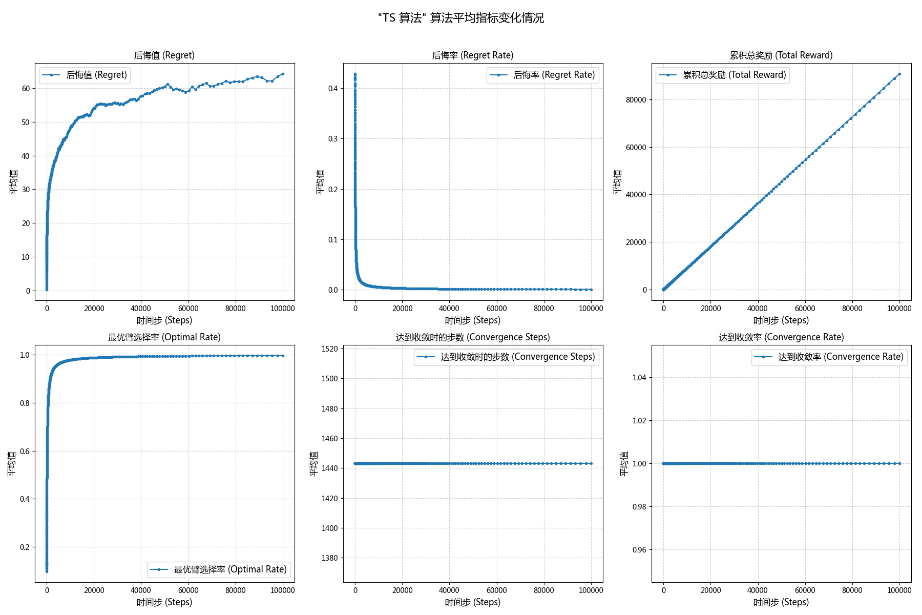 - UCB1 和 TS 的后悔率则持续下降并无限趋近于 0,表明它们最终能做到几乎“不再后悔”。其中,TS 的后悔率下降速度显著快于 UCB1。