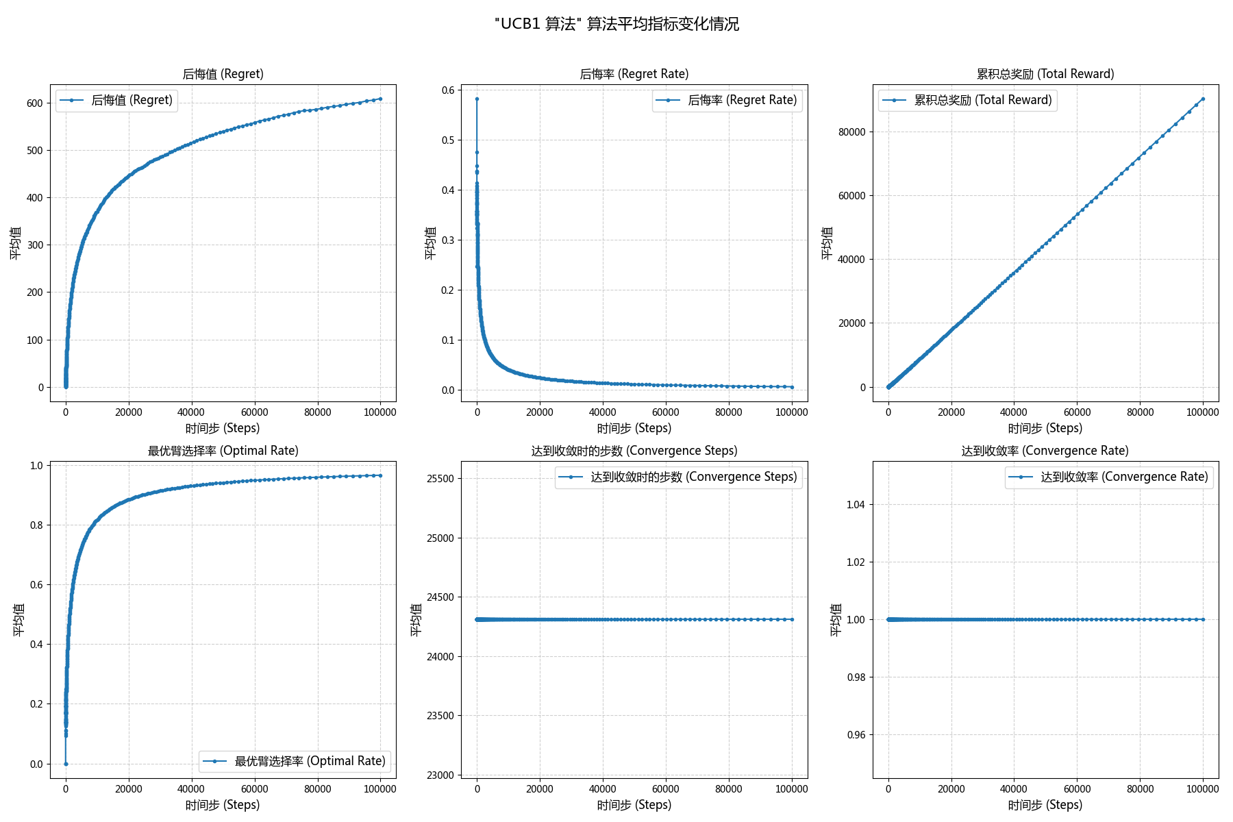 | 算法名称 | 遗憾值 | 遗憾率 | 累积奖励 | 最优动作率 | 收敛步数 | 收敛率 |