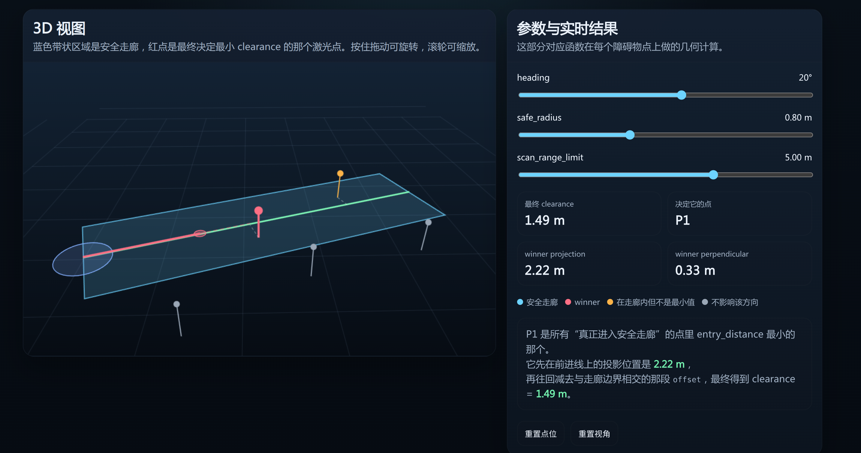 该函数我们传入 3 个参数,分别是 heading(弧度), safe_radius (安全半径)和 scan_range_limit(我们设定的最大感知范围)。